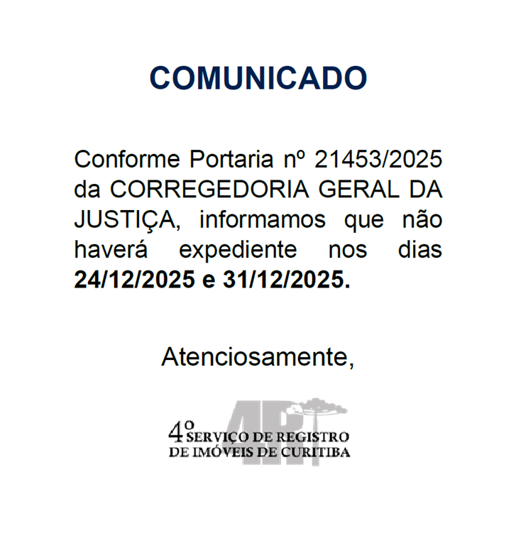 O 4º Serviço de Registro de Imóveis de Curitiba/PR agradece por utilizar nossos Serviços. Disponibilizamos este site para que você receba os melhores benefícios e segurança nas realizações de seus negócios.